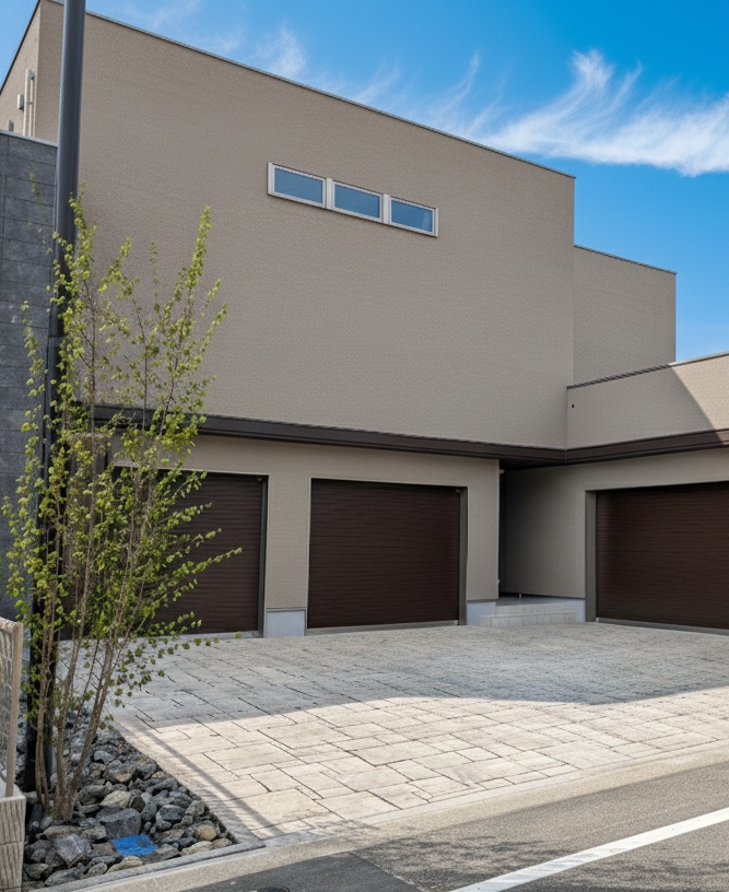 インナーガレージ付き新築邸宅|スタンプコンクリート外構施工事例