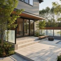 高級感のあるテラス屋根、大判タイルでのタイルデッキ施工事例