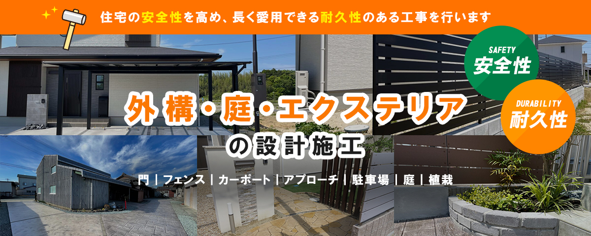 門やフェンス、カーポート、玄関アプローチ、ガレージ車庫、駐車場、タイルデッキ、テラス