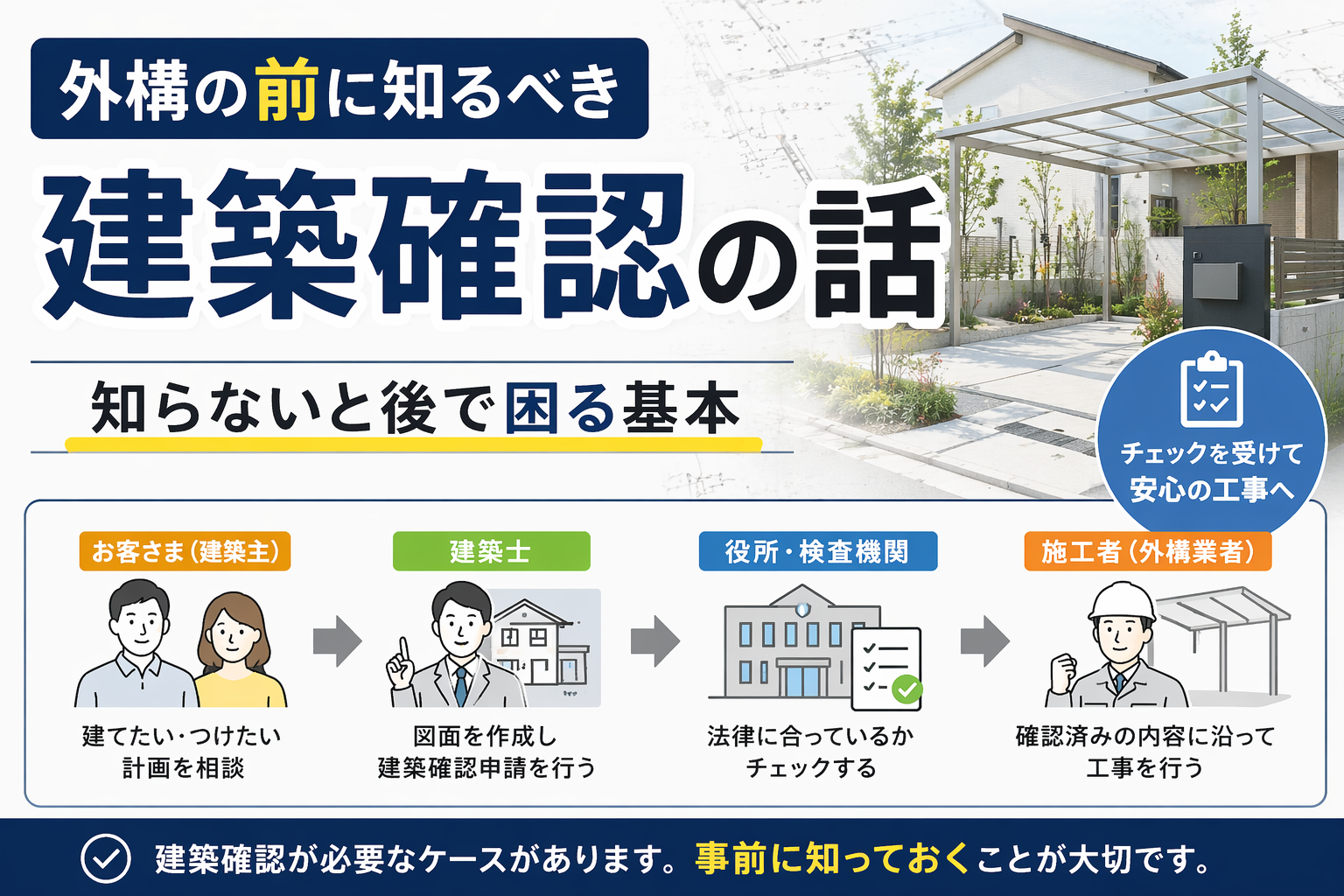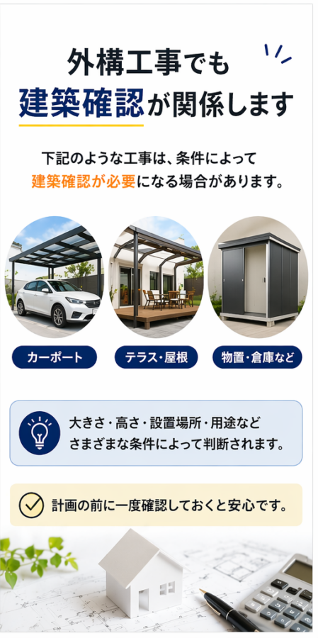 特にカーポートやテラス屋根など、外構工事でも建築確認が関係する場面が増えてきています。