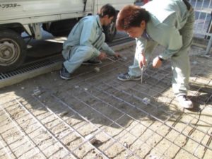 インターロッキングブロックを撤去、ひとつひとつ、バールを使って取り外して行きます。その後は路盤の高さ調整をしてコンクリートを平均に打ちます。