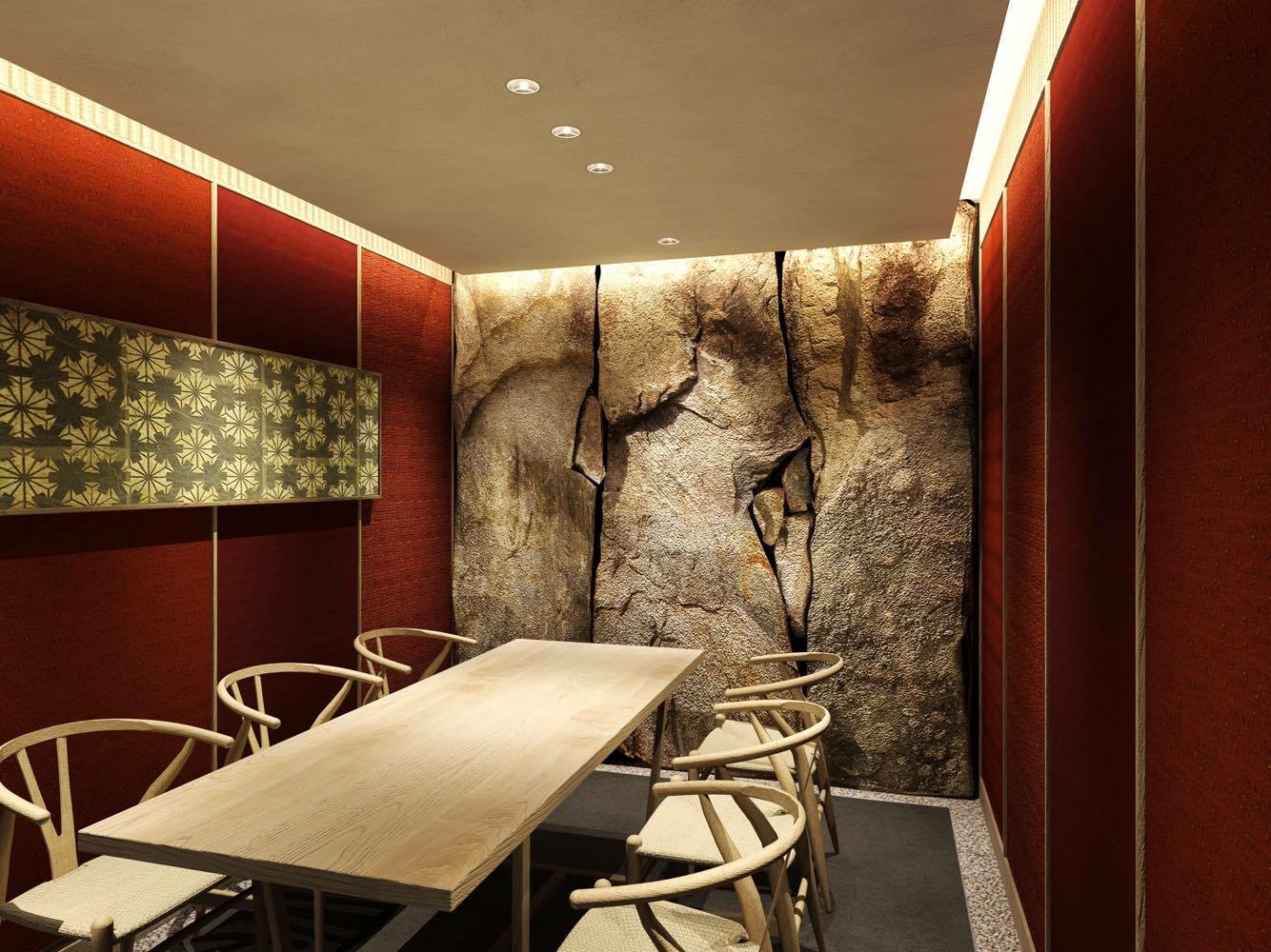 和風個室に“本物以上”の石肌を。照明で陰影が際立つ。