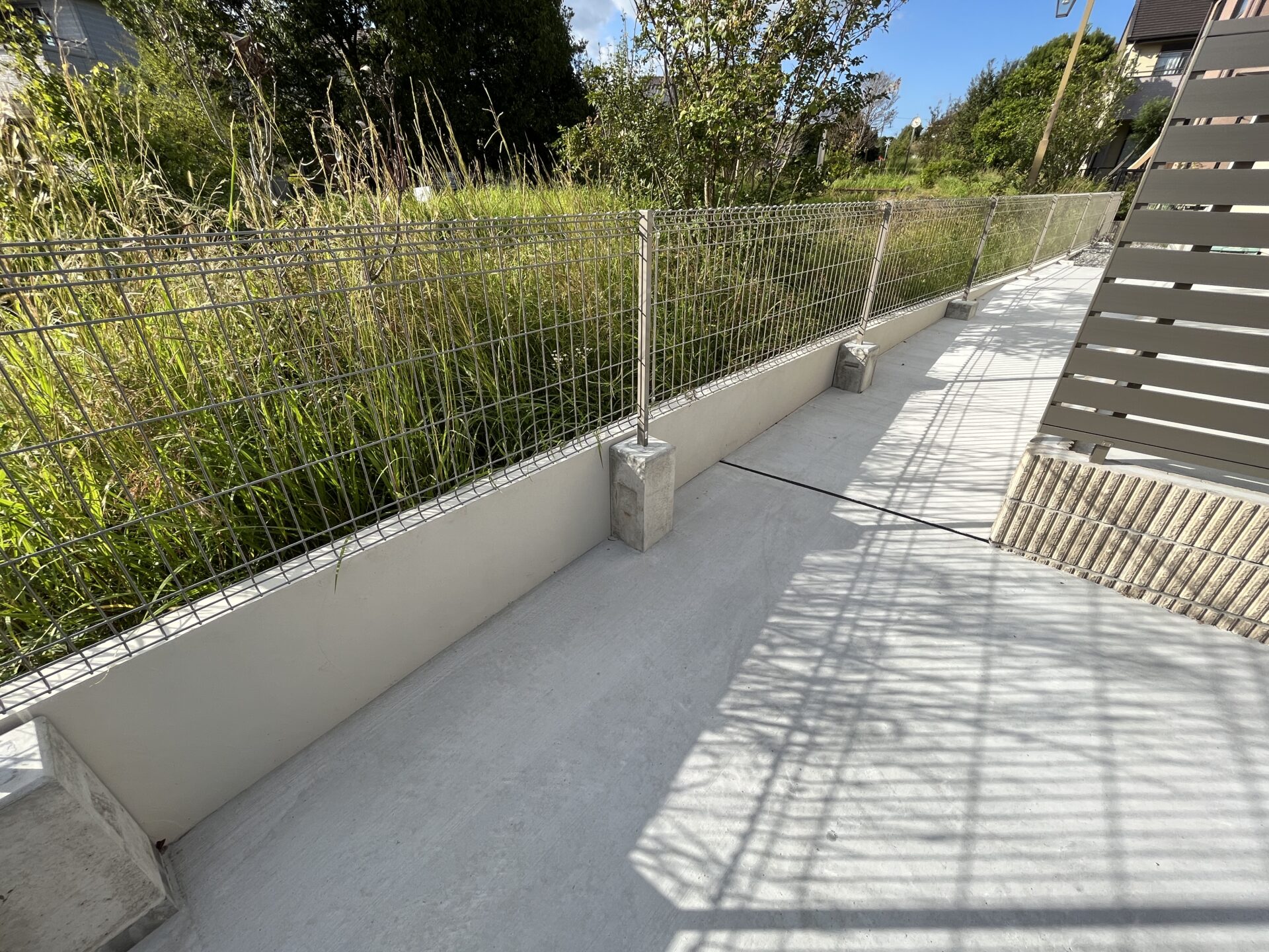 プライバシー確保が求められる箇所には目隠しフェンスを、開放感を重視する境界にはメッシュフェンスを。