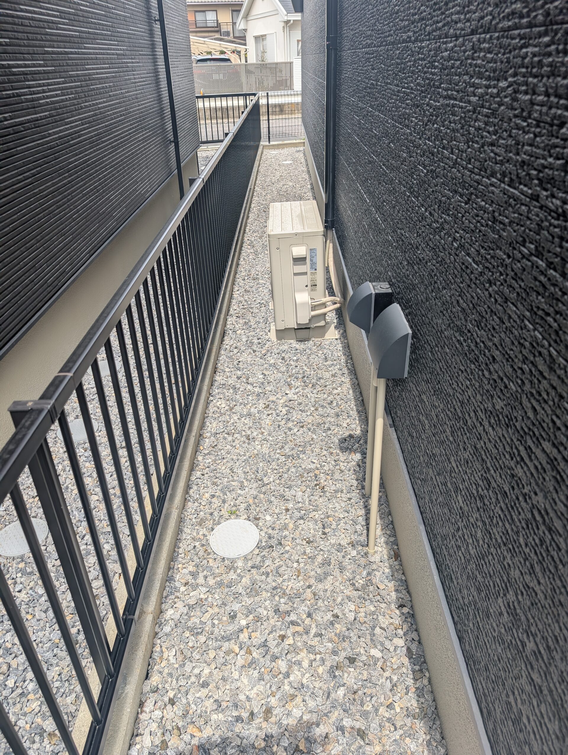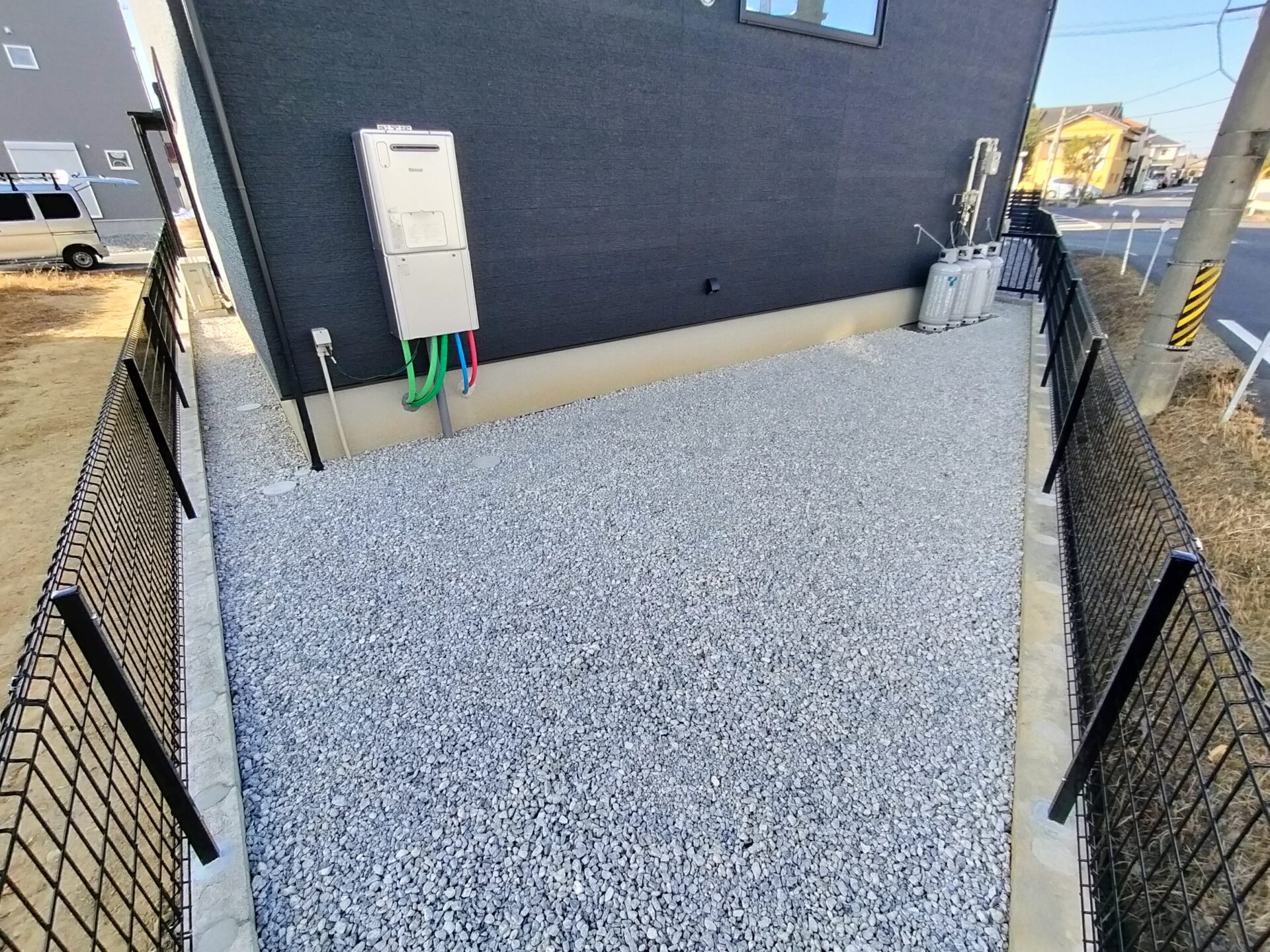建物周囲は防草シート+化粧砂利仕上げで雑草対策
