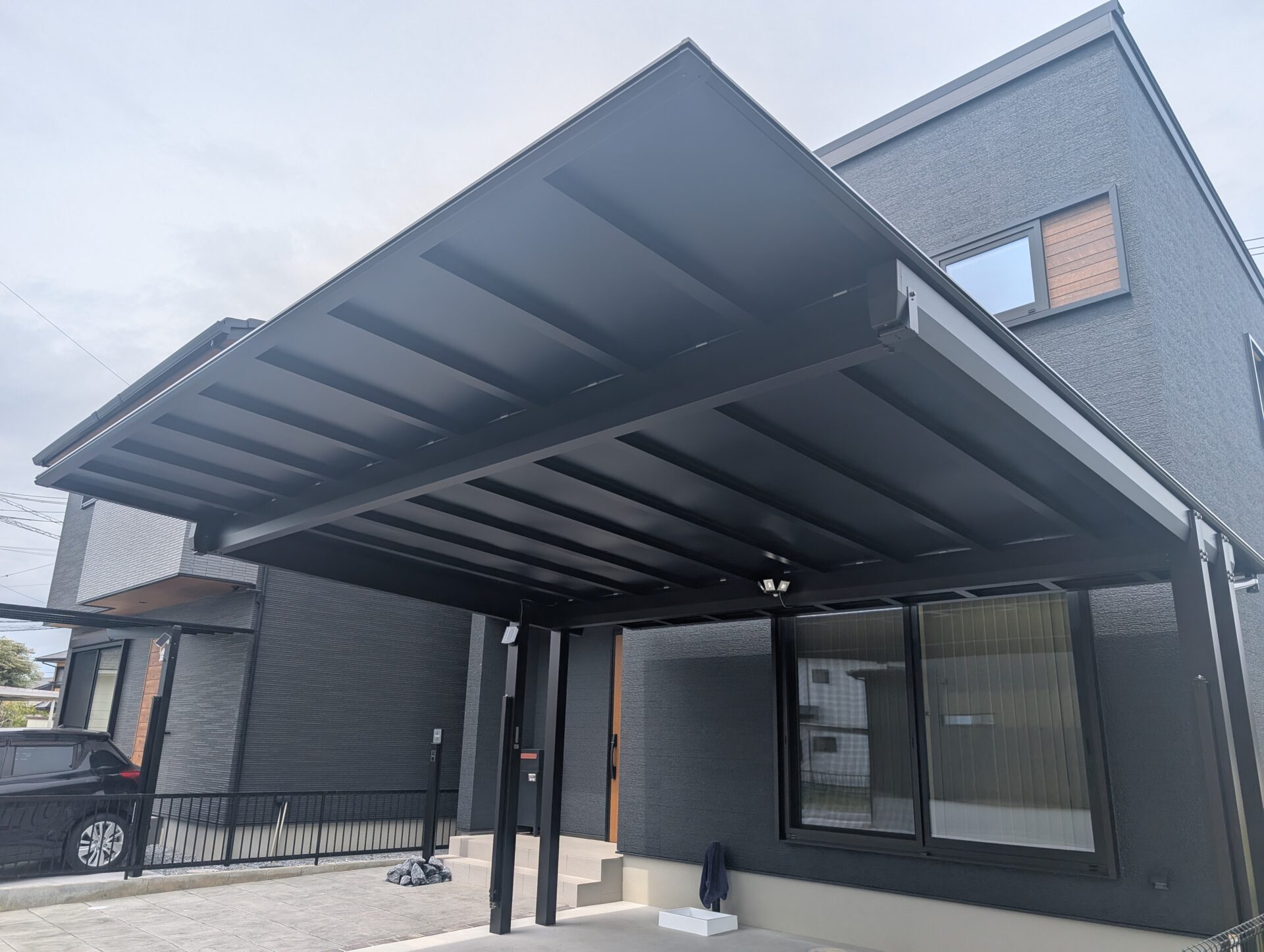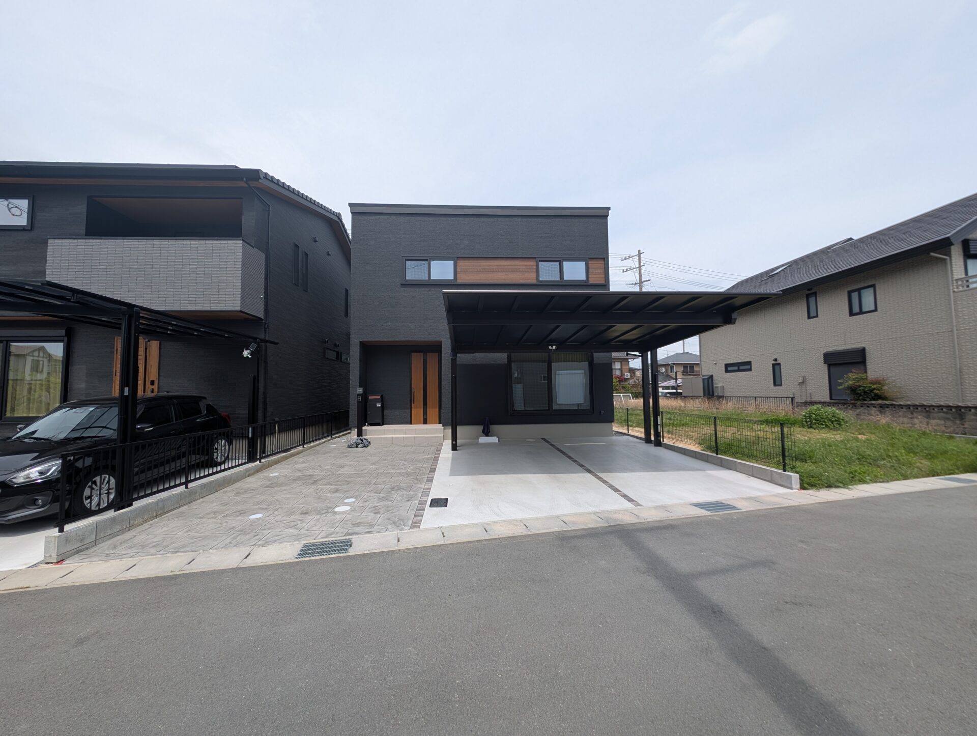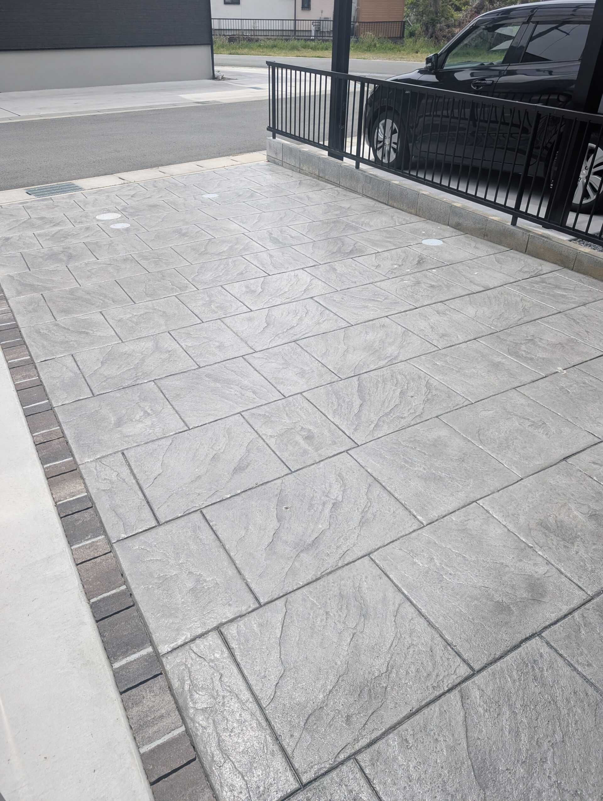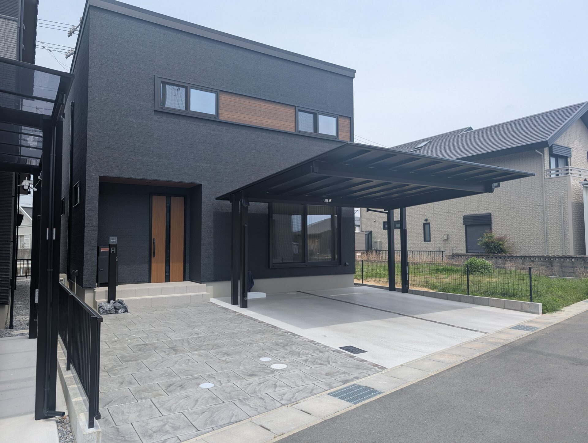 アイ工務店様×新築外構|後方2本柱カーポートとスタンプコンクリートの玄関アプローチ