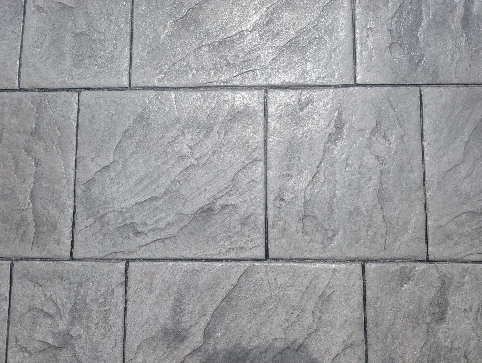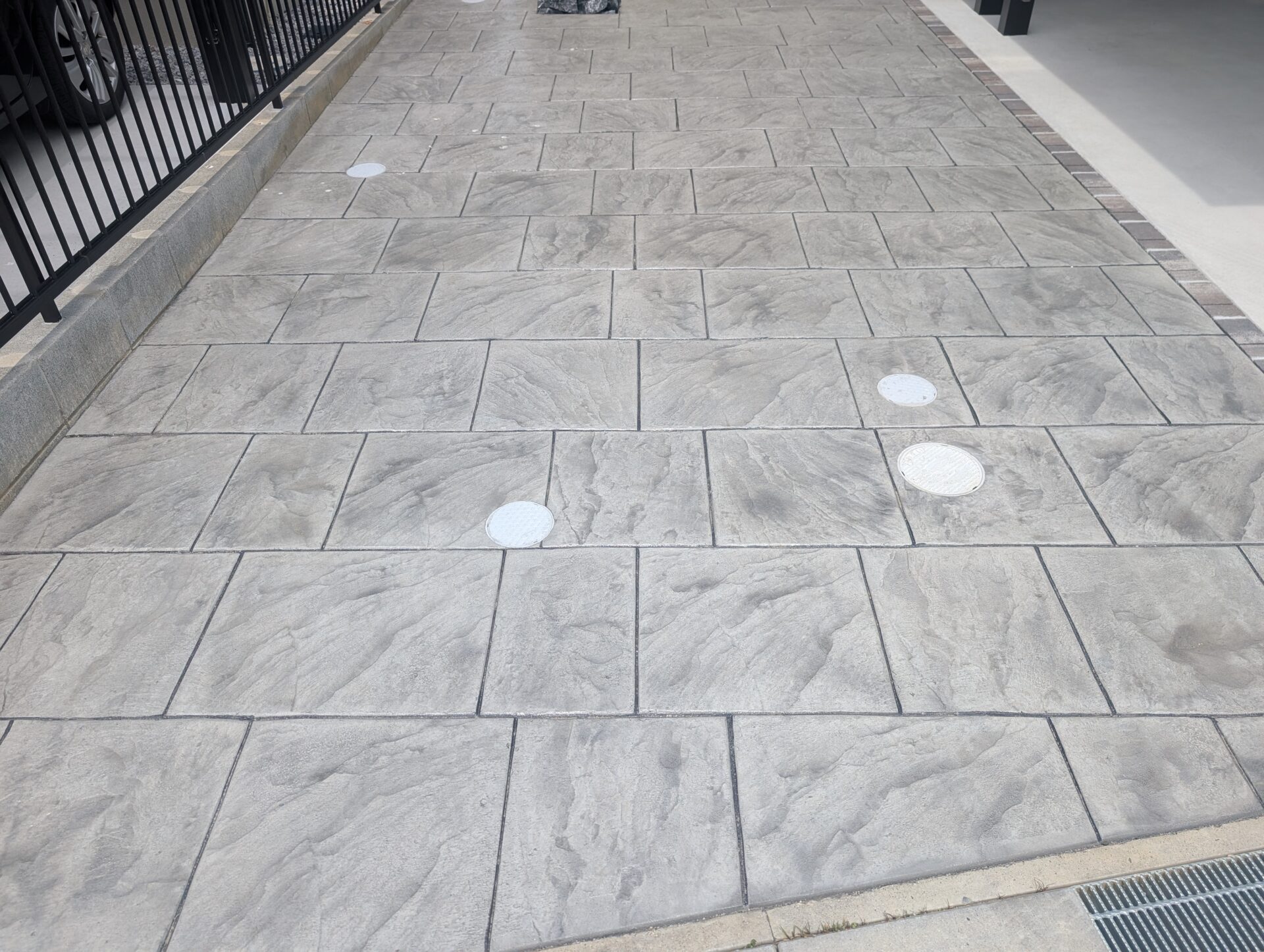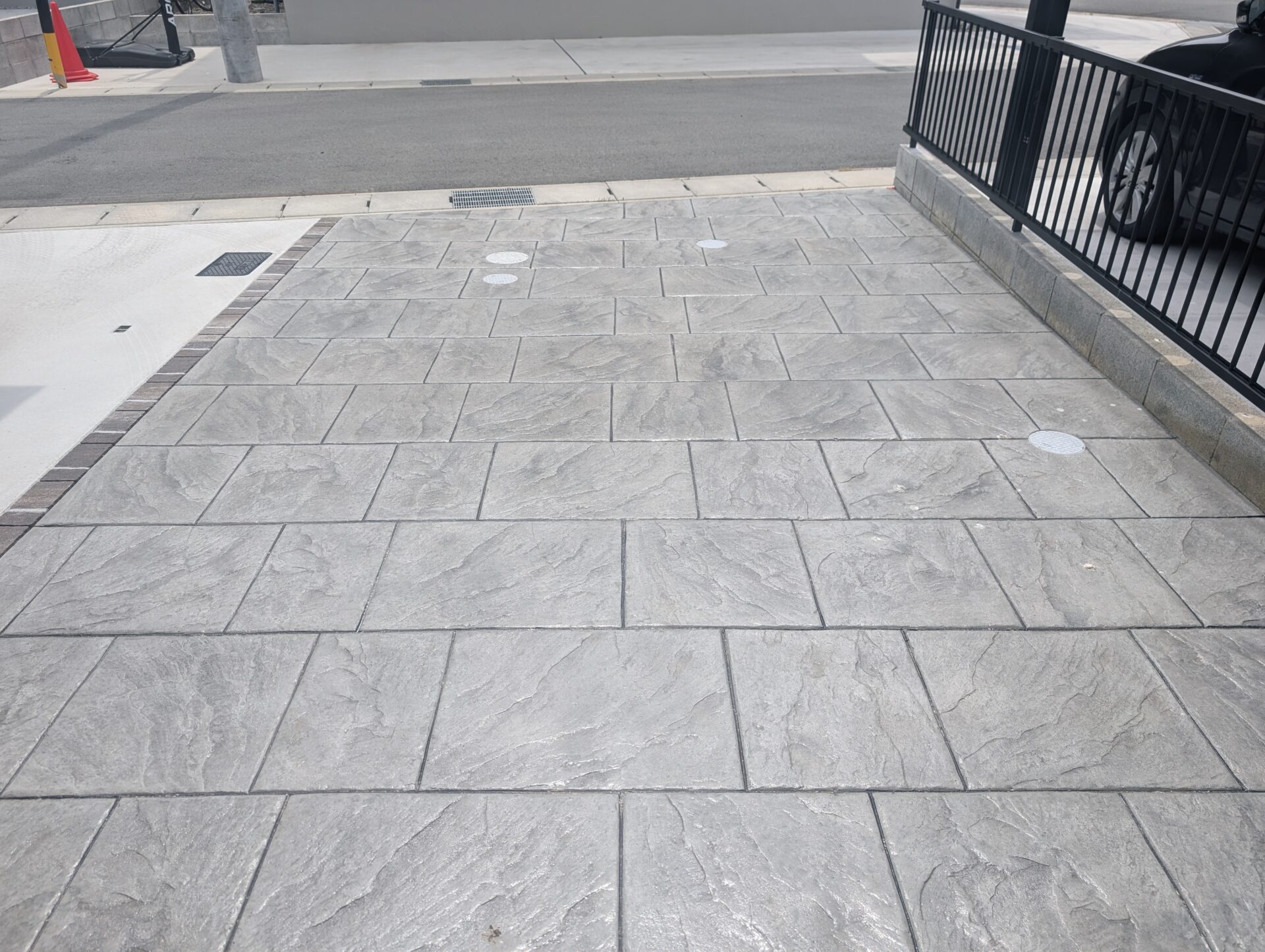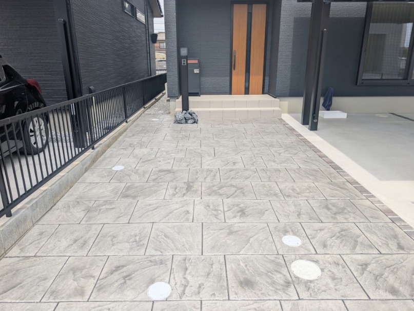 ポーチからアプローチにかけて、石張り模様のスタンプコンクリートを施工