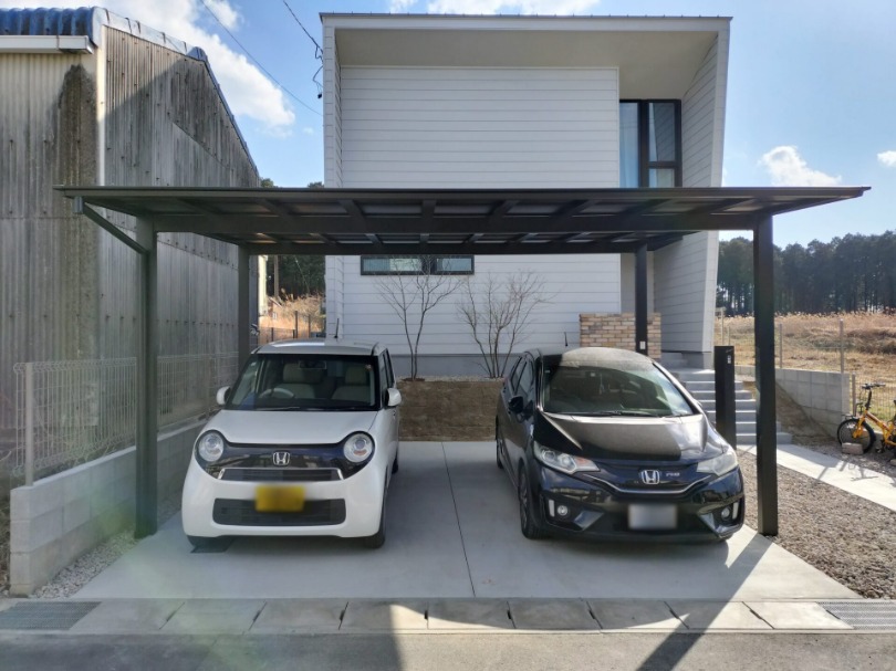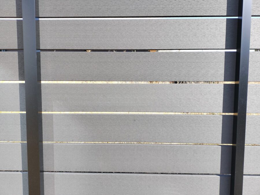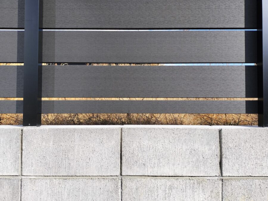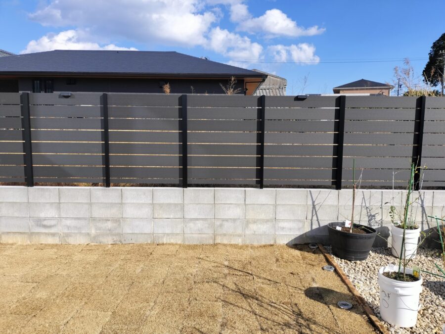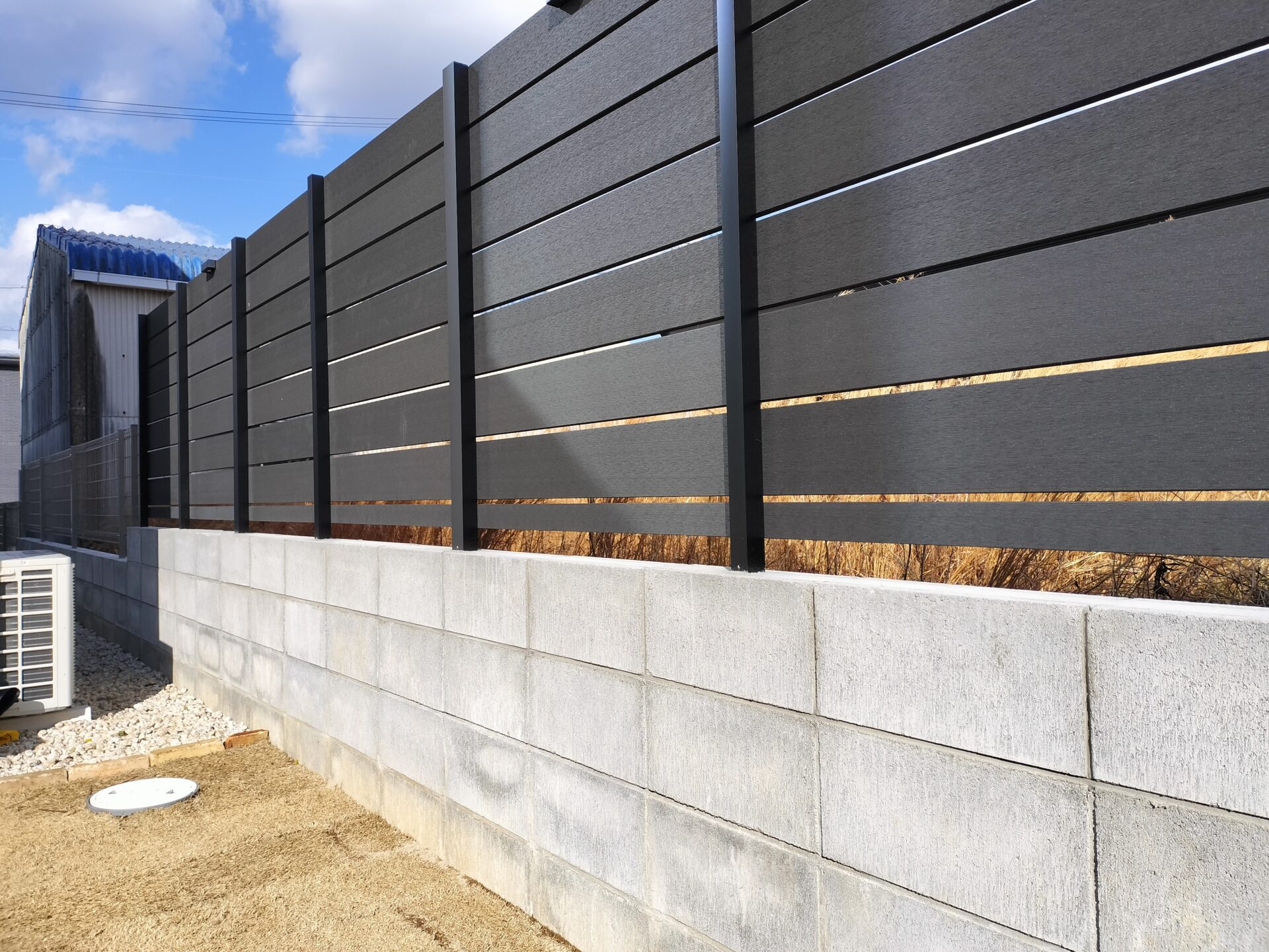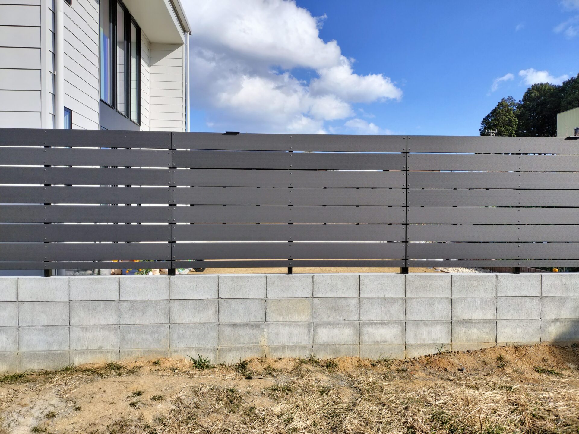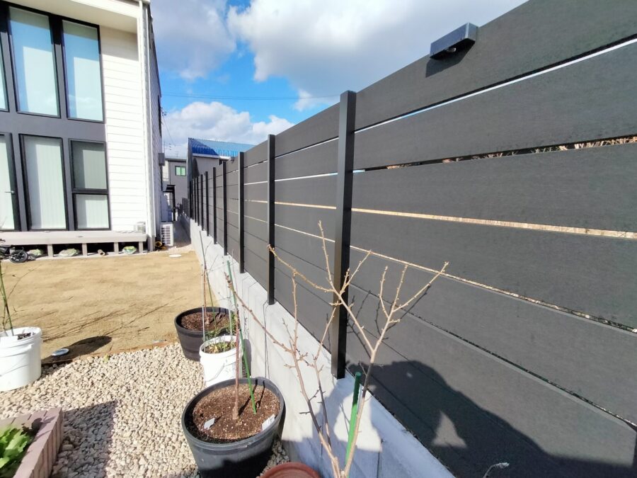 板色はシックグレー、柱はマットブラックで、現代的な外観と目隠し効果を両立しています。