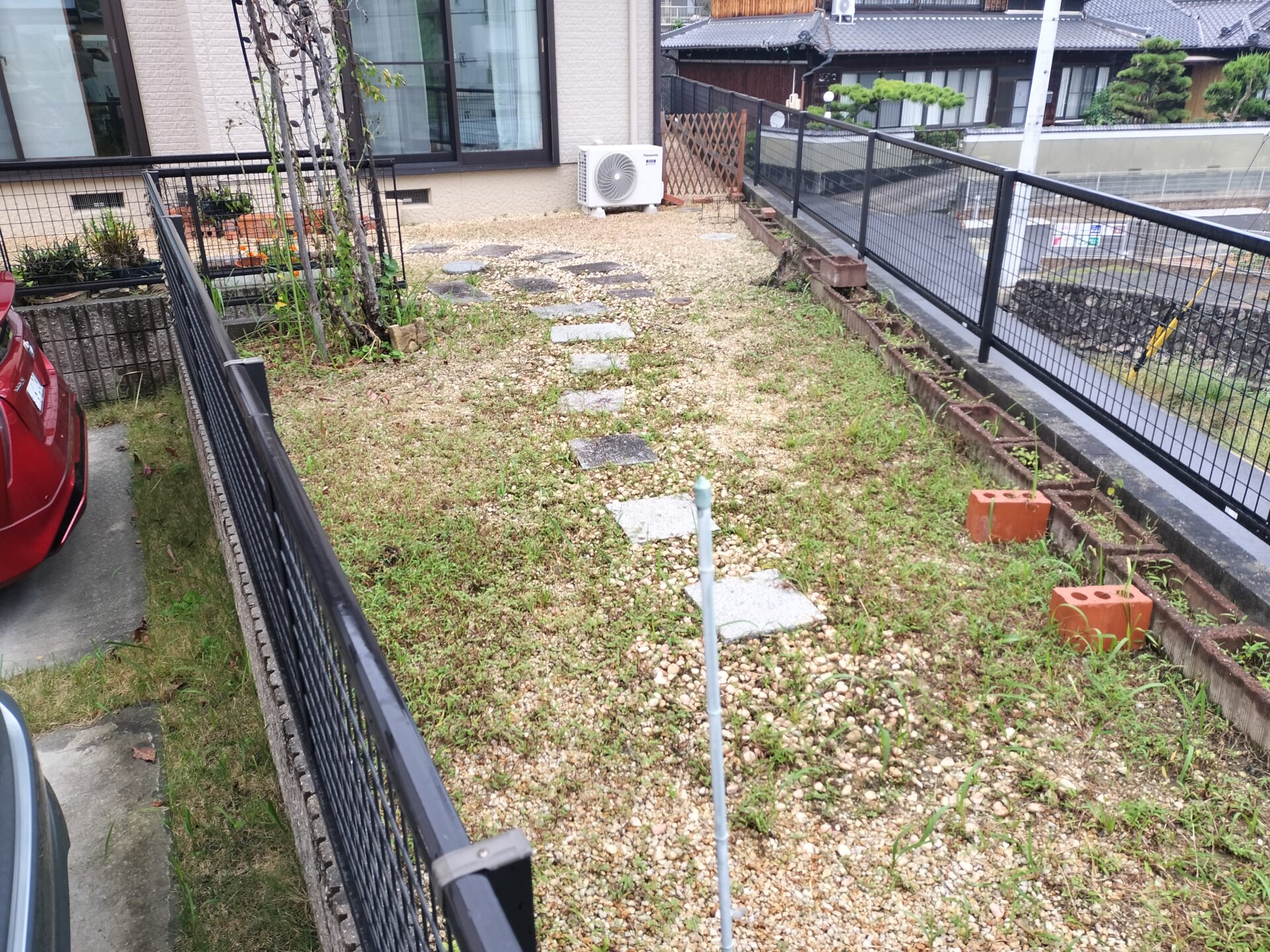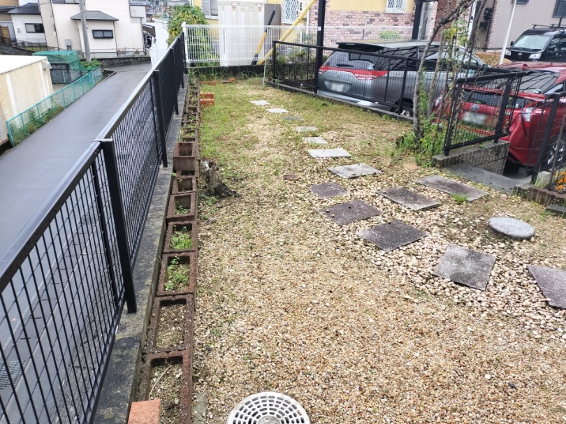 雑草対策だけでなく、雨水の流れや段差、動線の見直しも行いました。メインテーマは「草むしりゼロ」と「排水改善」。職人の経験を活かし、勾配・排水経路を細かく調整する設計です。