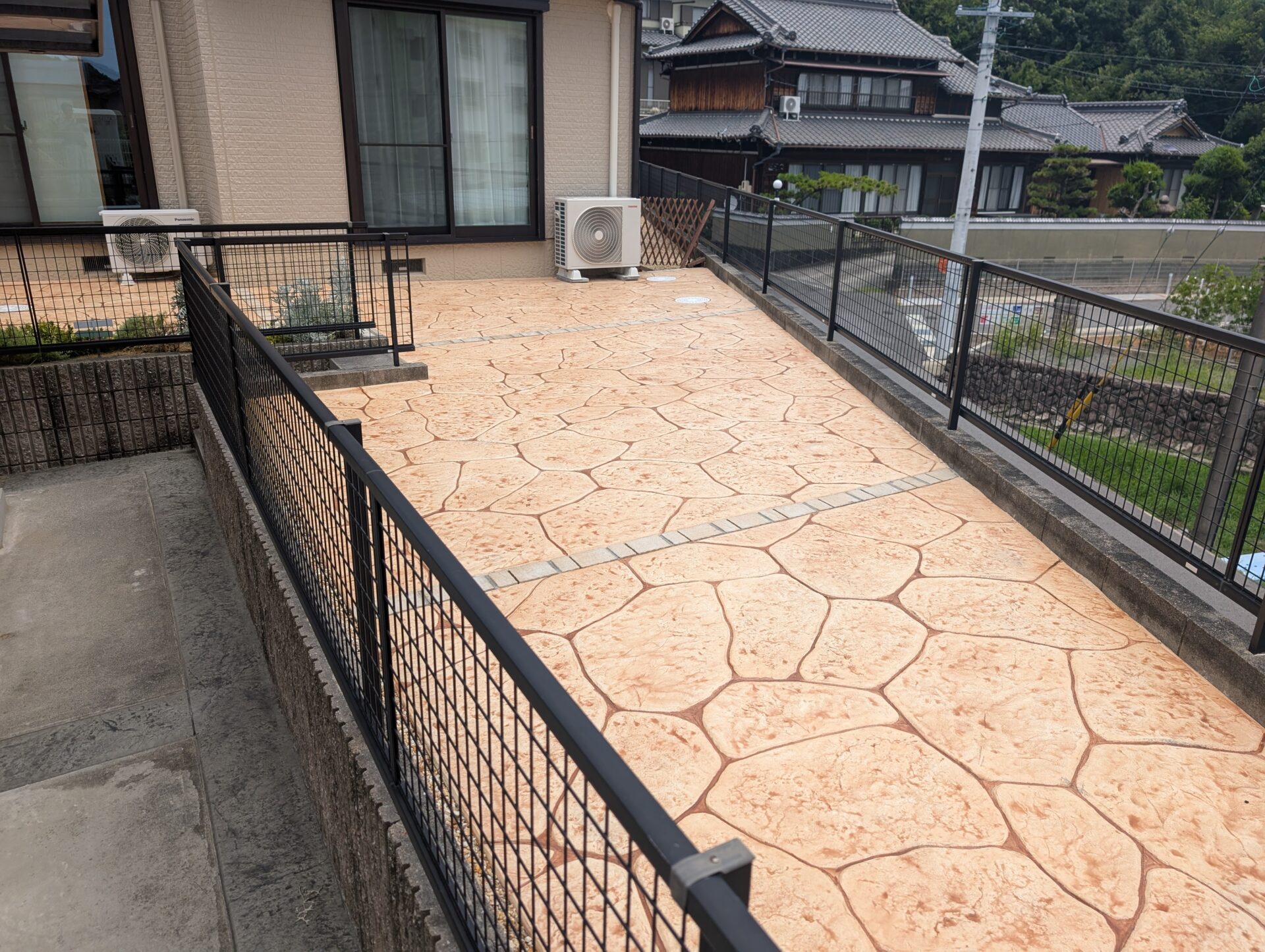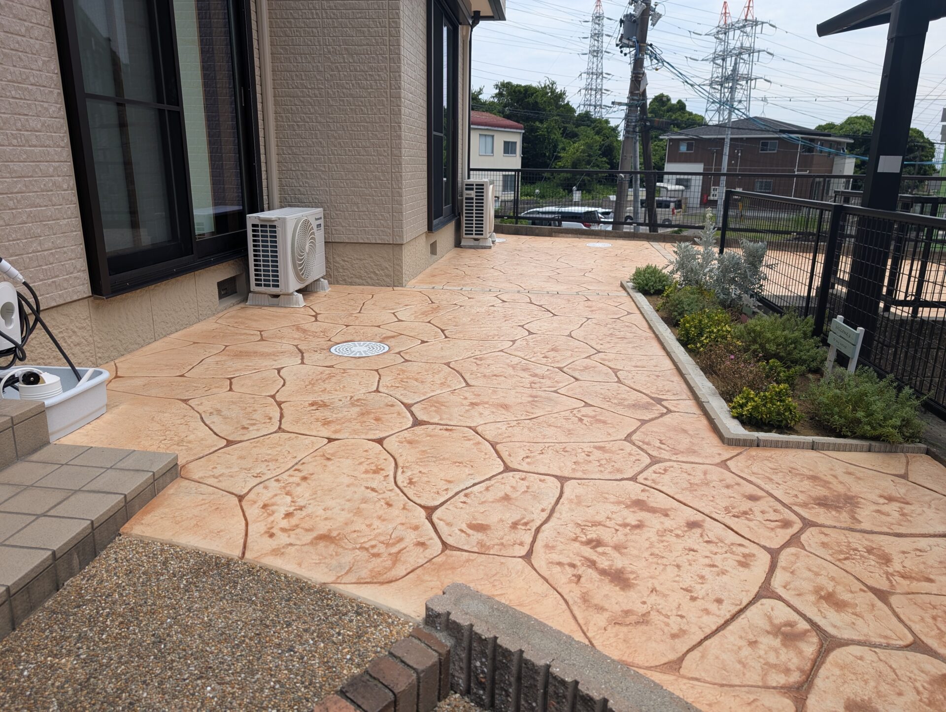 単にコンクリートで固めるのではなく、見た目にもこだわりたいという施主様の希望を反映し、職人仕上げのスタンプコンクリートを採用しました。