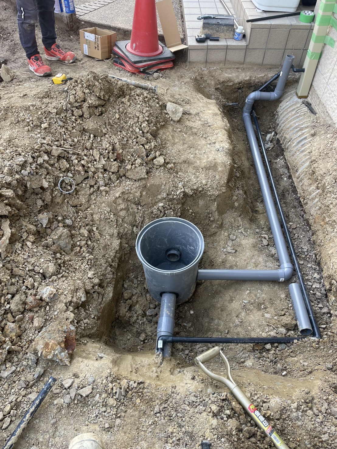 排水不良の原因は、盛り土による地盤の高さと勾配の取りづらさにありました。