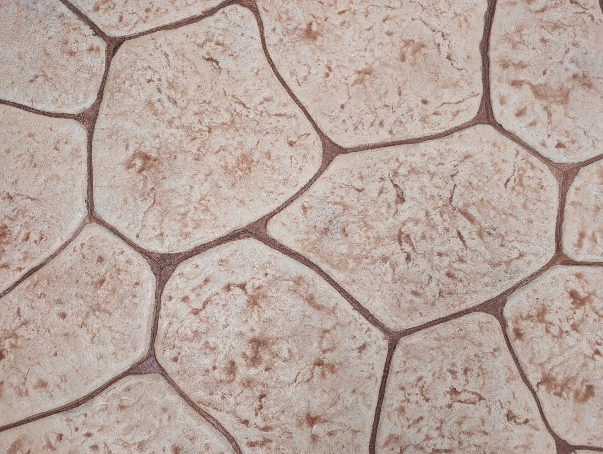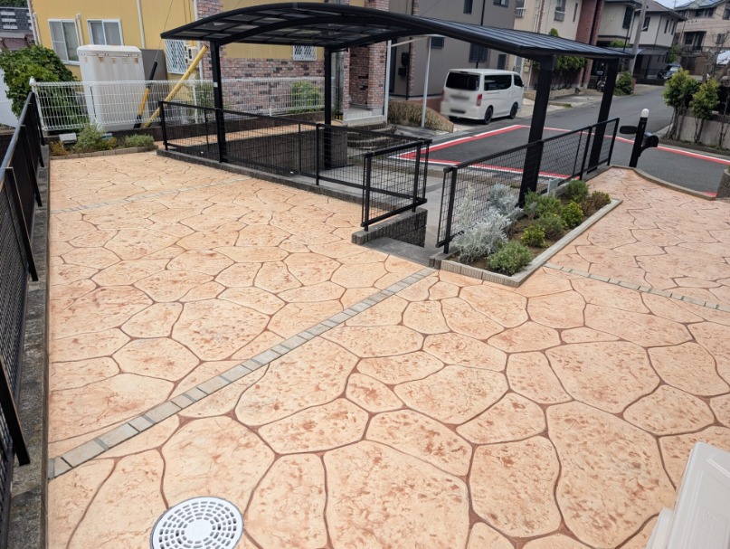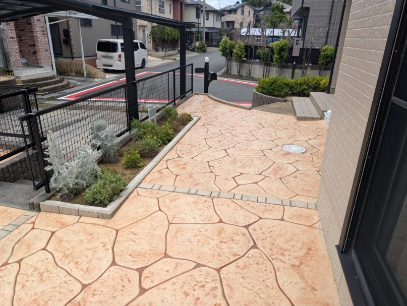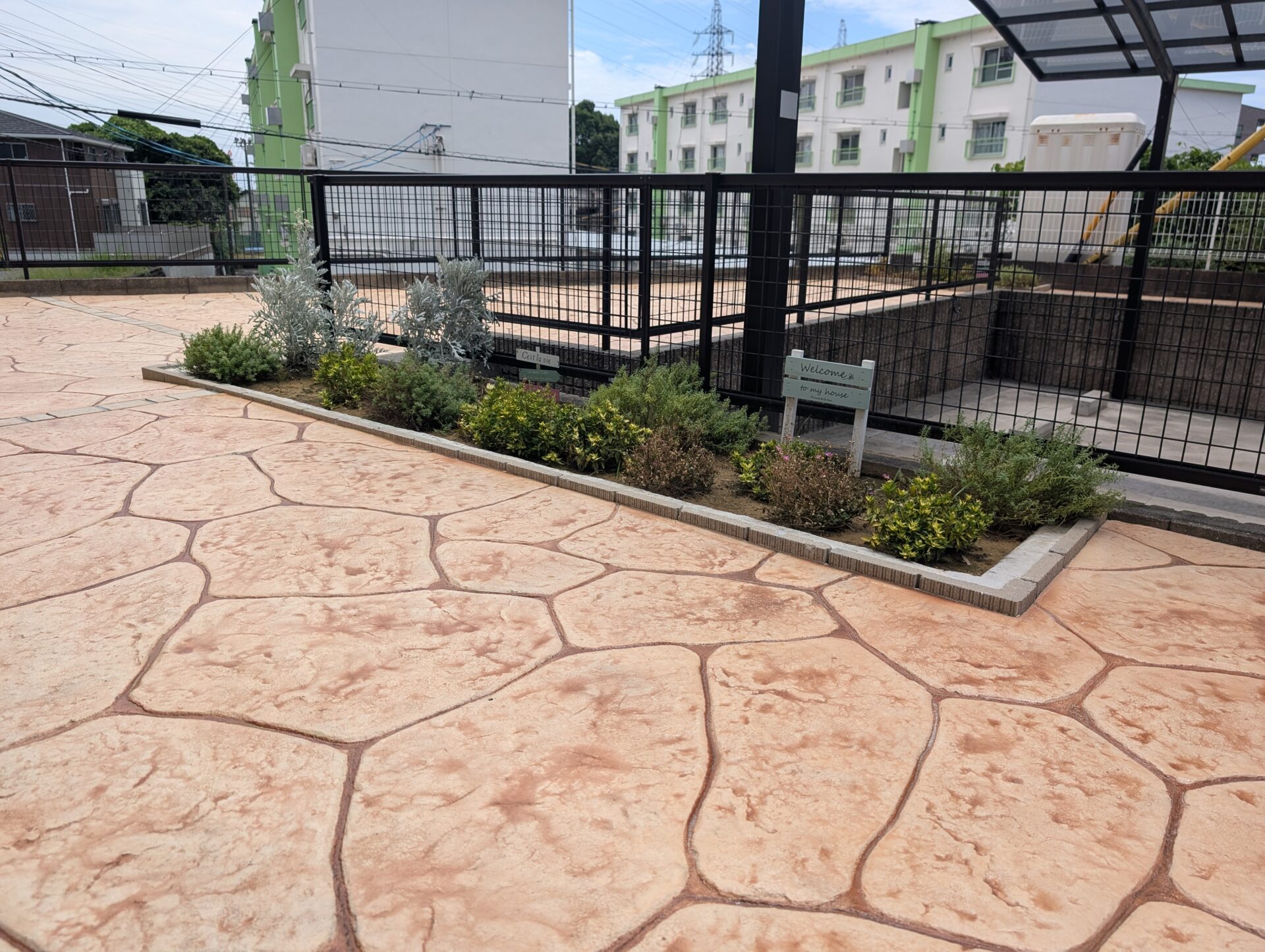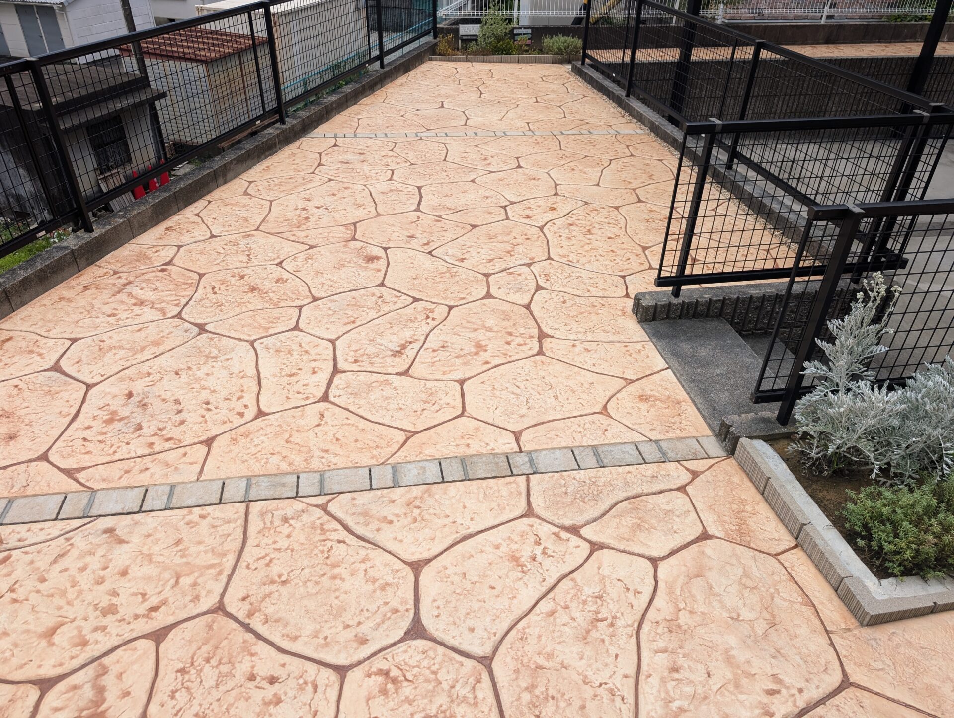 スタンプコンクリートは、職人が現場で仕上げる「地続きのデザイン」。タイルのように反りや段差が出ず、美観と耐久性を兼ね備えています。